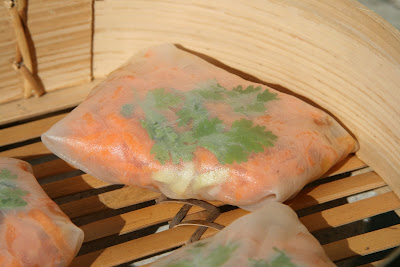 Take the roll out of the water bath and lay it on a flat surface. Lay a cilantro leaf first on the roll (it'll look pretty when you turn it over), then a tbsp of the corn onion mix. Now add the grated carrot, and then sprinkle some chopped spring onion on top.