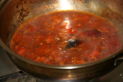 Heat the oil in a little pan. Add the mustard seeds and red chillies. When the mustard begins to pop, add the raisins and tomatoes. Continue stirring until the tomatoes start getting mushed and turn a darker red.
