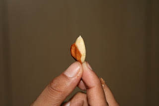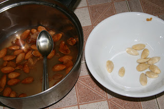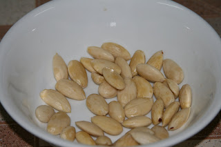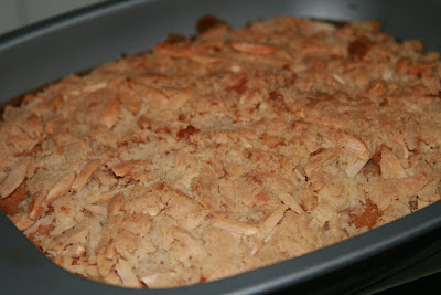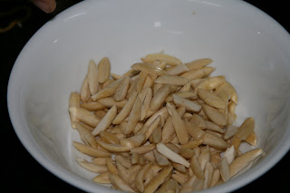 In case you're looking at those almonds and saying those aren't peeled or slivered, you're right of course. I forgot about that step until I got to the "for the topping" part and I was stumped! And then I remembered a little passage written by Jamie Oliver in the book I was currently reading "Don't Try This At Home" (a funny collection of short stories by brilliant chefs). Jamie Oliver had written about how in the start of his culinary career he had had to peel hundreds of almonds! And I used his method: Let the almonds soak in hot water for a few minutes - and then the peel just slips off. Its very easy. So I peeled all of them and slivered them.