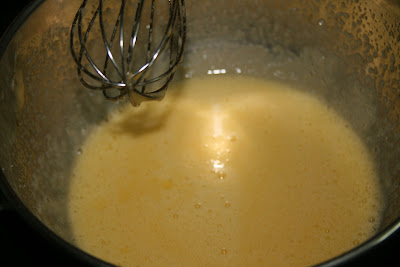 Beat eggs and sugar until it becomes white (it just never happened for me - remained yellow, so I just gave up! But I was doing it with a whip, maybe in an electric contraption, it might become white).