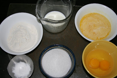 Sift the dry ingredients (baking powder and flour) and stir into the egg mixture, adding the milk and butter. Mix well till combined. Pour into a cake pan and bake at 175 deg C for about 20 mts.